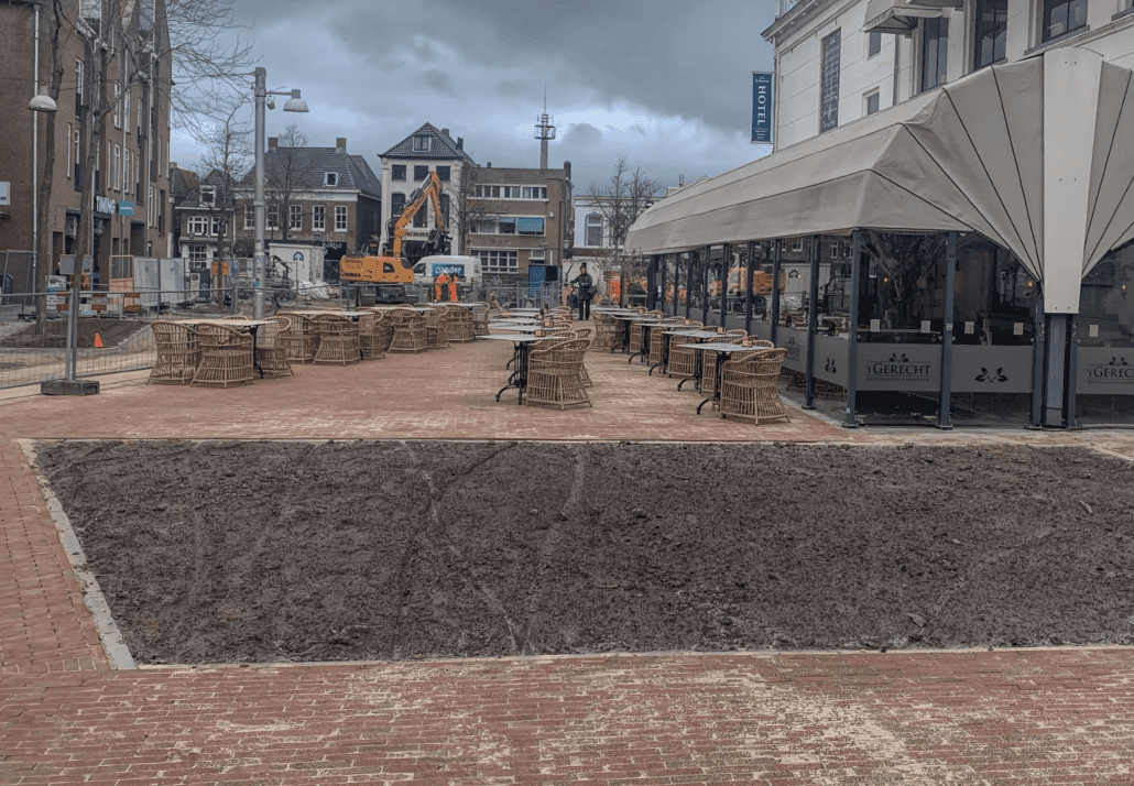 De verhoging van het plein is afgerond. Daarmee is een belangrijke stap gezet. Ook de contouren van de plantenbakken zijn goed te herkennen. Waar eerst vooral een werkterrein lag, ontstaat nu steeds meer een groen en uitnodigend plein. Deze maand worden de eerste planten geplaatst. Het groen zorgt straks voor kleur en sfeer. Een plek om te verblijven, te ontmoeten en tot rust te komen midden in het centrum.